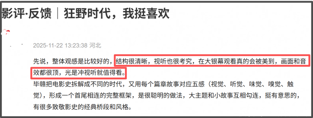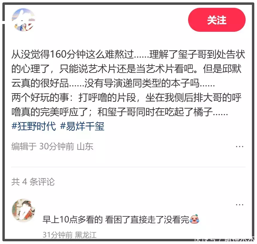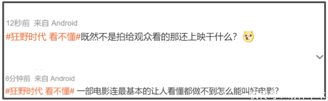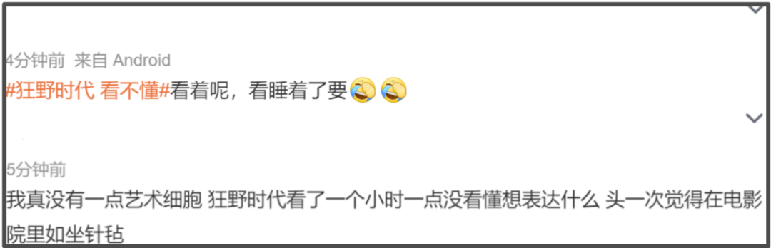 另外,《狂野时代》上映之日,第一波影评出炉之后,“《狂野时代》看不懂”的话题直接登上了高位热搜。热搜广场上,大批的网友叙述着自己不愉快的观影经历,直言“要看睡着了”、“头一次觉得在电影院里如坐针毡”。此外,还有人发出灵魂提问“一部电影连最基本的让人看懂都做不到,那么怎么能叫好电影”,这样的电影上映的意义是什么?
