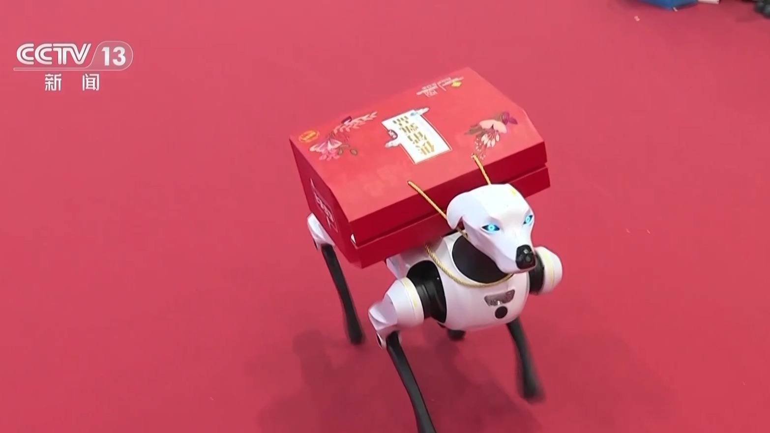第一位“机器人朋友”就是颜值与实力并存的机器狗。可别小瞧它,在今天的年货市集上,它可不只是来“耍帅”的。凭借着超强的负载能力和灵活的移动性能,它可是咱们采购年货的得力帮手。不管是沉甸甸的粮油米面,还是包装精巧的礼盒特产,只要交给它,就能稳稳当当送到车前,让大家采购少了搬运的烦恼。